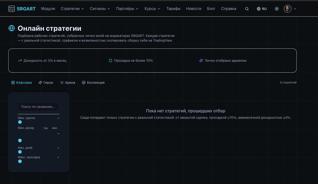 Запускаю новый раздел: онлайн стратегии!Сюда буду выкладывать свои сборки стратегий, которые собираю на TradingView с помощью системы индикаторов SrgArt. Эти стратегии будут проходить предварительный бэктестинг и потом уходить на онлайн запуск. То есть, после запуска, стратегия будет с обнулённой статистикой и профитом, но будет с течением времени накапливаться. Лучшие стратегии можно будет скопировать по ссылке на свой аккаунт TradingView (уже настроенные) и запустить в работу на свою биржу через URL-вебхуки.