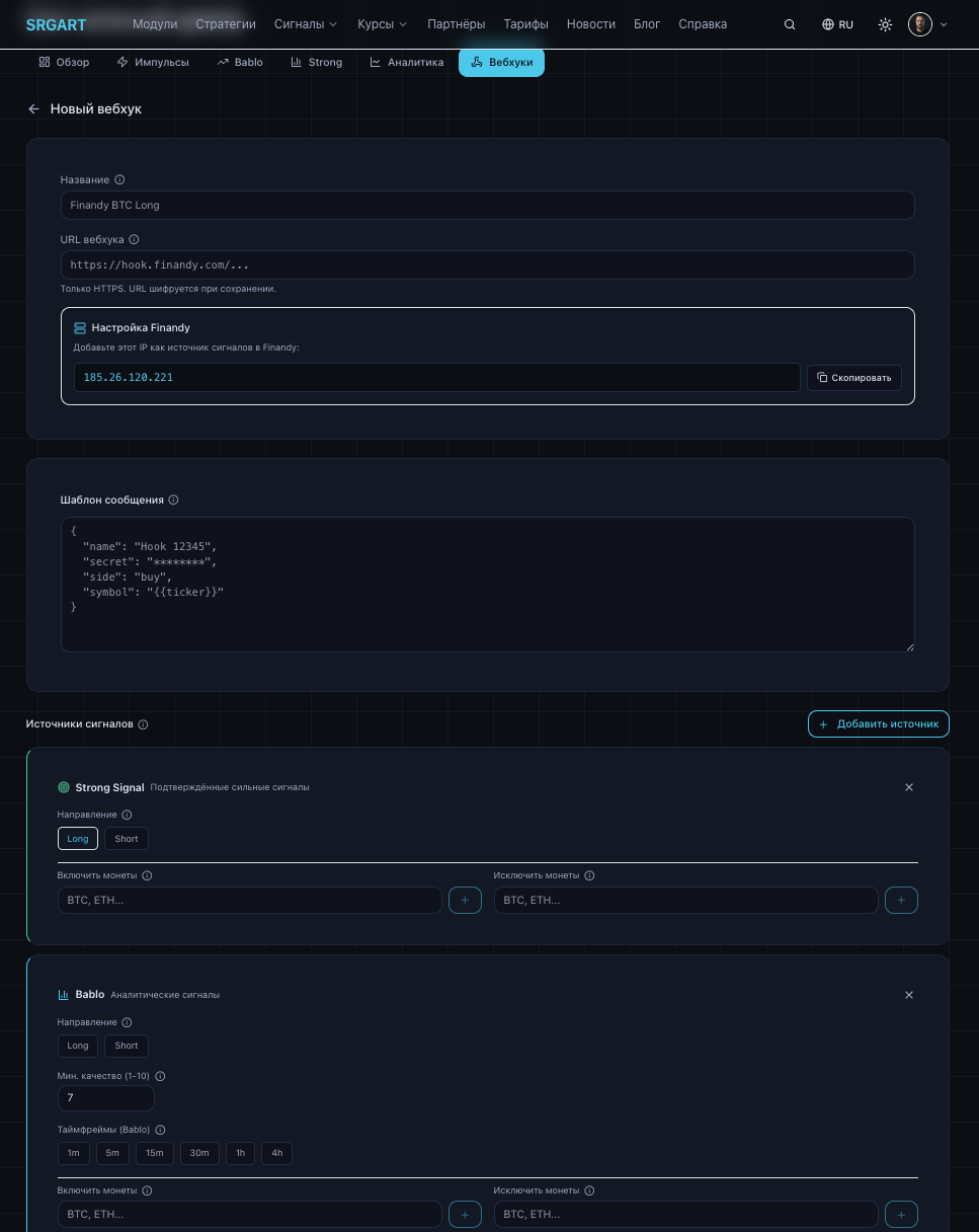 Теперь появилась возможность не только смотреть и анализировать поступающие сигналы в "Сигнальный центр", но и формировать веб-хуки для запуска ботов на платформе Finandy!