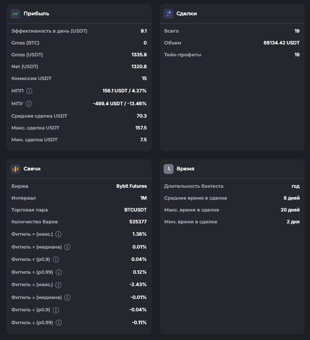 Внимание: Торговля на финансовых рынках связана с рисками потери капитала. Результаты бэктестов не гарантируют будущей доходности. Настройки подобраны для информационных целей и не являются инвестиционной рекомендацией. Любые решения о торговле вы принимаете самостоятельно.